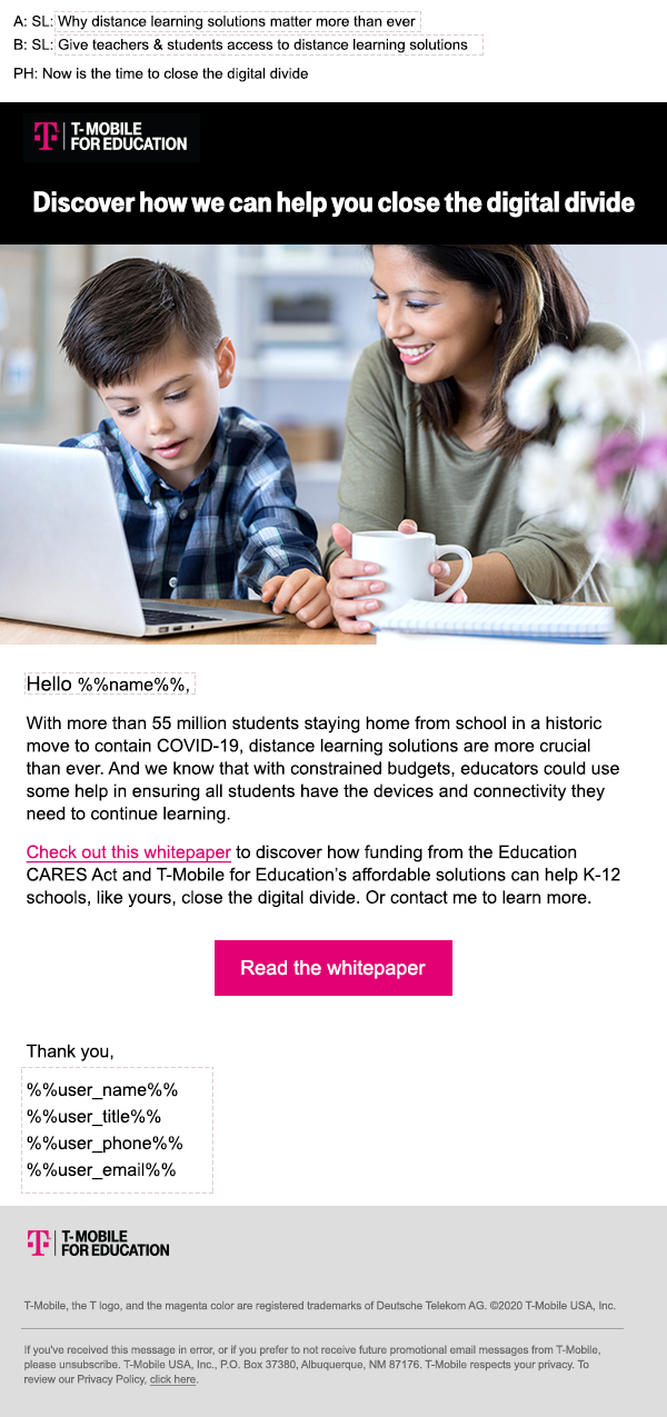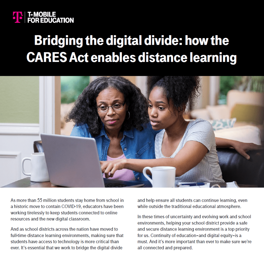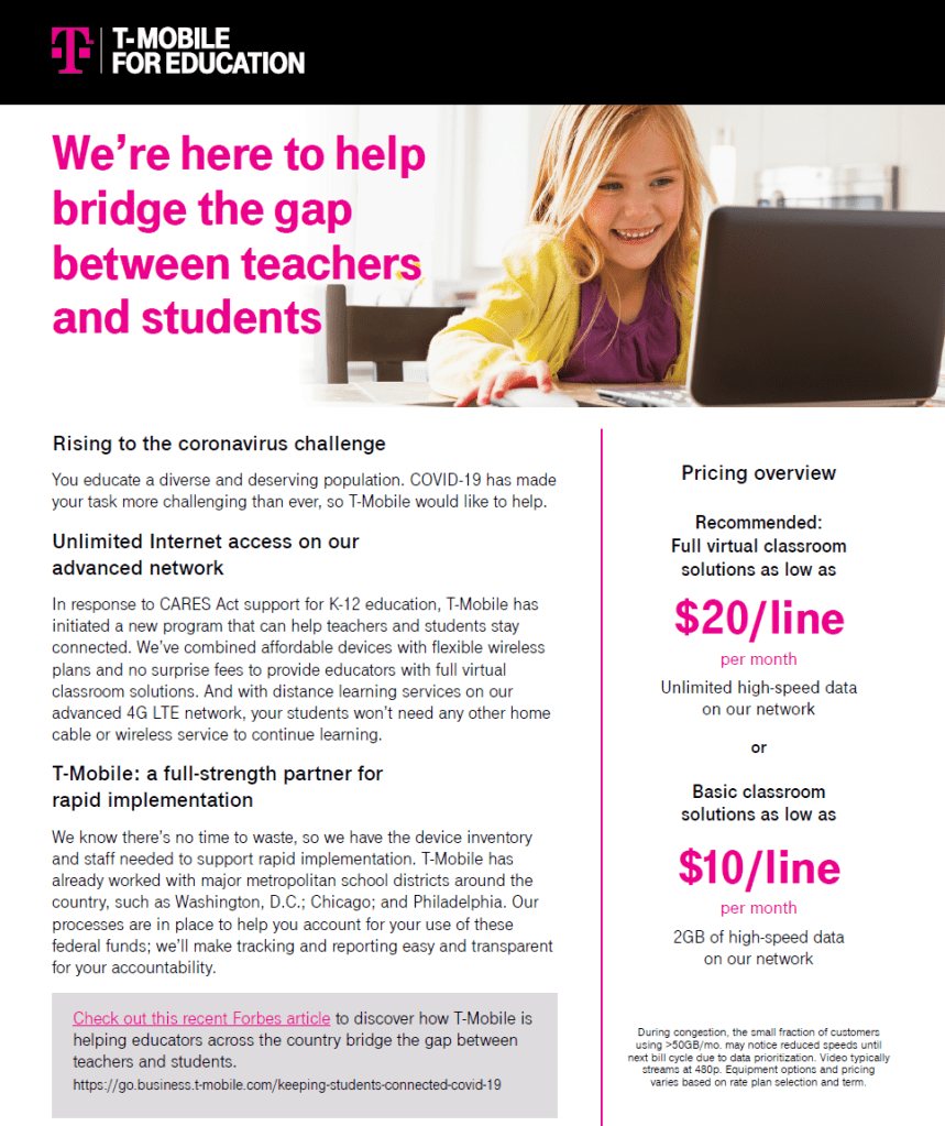 CARES Act Wrote and edited bill of materials explaining how T-Mobile for Business helps keep educators and students across the country connected by providing distance learning solutions in response to the CARES Act. Whitepaper Flyer Email Related