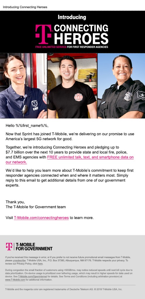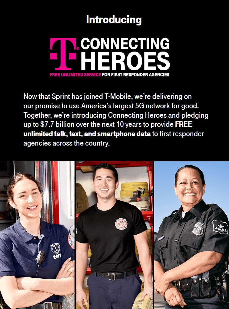 Connecting Heroes Wrote and edited a bill of materials for T-Mobile’s Connecting Heroes, a plan that provides free talk, text, and data to U.S. first responder agencies. Print Email Related